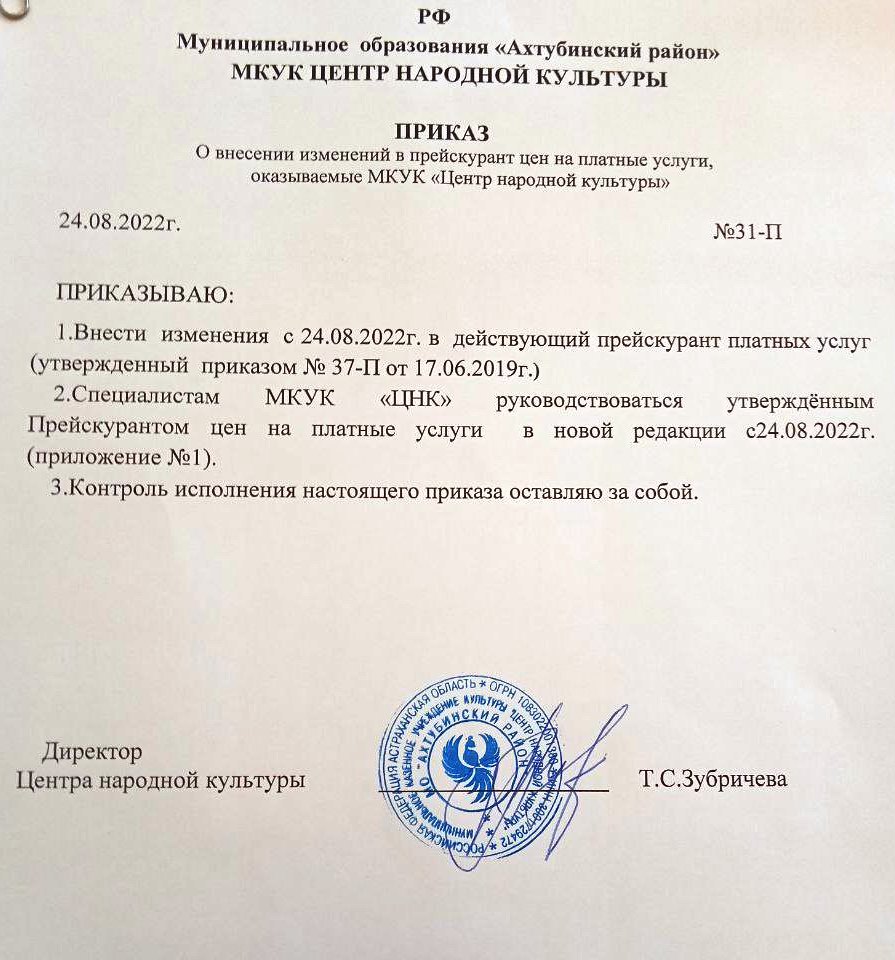 ПРИКАЗ № 26-П от 07.04.2017 об Утверждении прейскуранта платных услуг МБУК «Центр народной культуры»